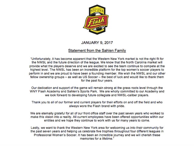 The owners of the Western New York Flash have posted on the team website that the franchise is officially sold to the North Carolina FC in Cary, North Carolina. The National Women’s Soccer League franchise will be moving immediately and play its 2017 season in North Carolina.